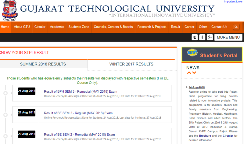 gtu.ac.in: GTU Result List 2018 Updated On 21st August, Check Here – Being on a continuous update, Gujarat Technological University (International Innovative University) has updated it’s official website with latest GTU Result List 2018 on 21st August once again. Following which, now, under Summer 2018 Result section, Result of BPH SEM 3 – Remedial (May 2018) Exam [Online Re-check/Re-Assess(Last Date for Student: 27 Aug 2018, Last date for Institute: 28 Aug 2018] AND Result of BE SEM 2 – Remedial (May 2018) Exam [Online Re-check/Re-Assess(Last Date for Student: 24 Aug 2018, Last date for Institute: 27 Aug 2018] are available.