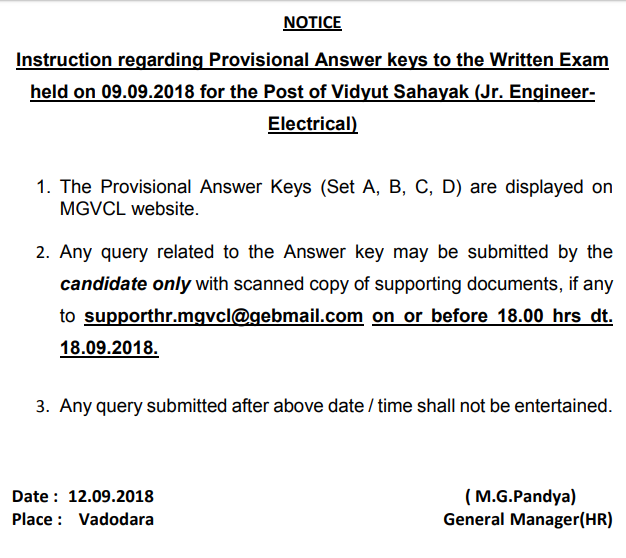 MGVCL Answer Key 2018 Out For Vidyut Sahayak (Junior Engineer Electrical) – Finally on URL – www.mgvcl.com/jobs.php, as a part of good news on official website of Madhya Gujarat Vij Company Limited, Answer Key for Written Test held on 9th September 20108 for the post of Vidyut Sahayak (Junior Engineer Electrical), MGVL is now available to download. Answer Keys are released separately for Set A, B, C and D according to MG Pandya who is General Manager. If candidates want to raise the objections against the official Answer Keys then they should do it before 1800 hours before 18th September 2018 on email address supporthr.mgvcl@gebmail.com also they should send the proof as well.