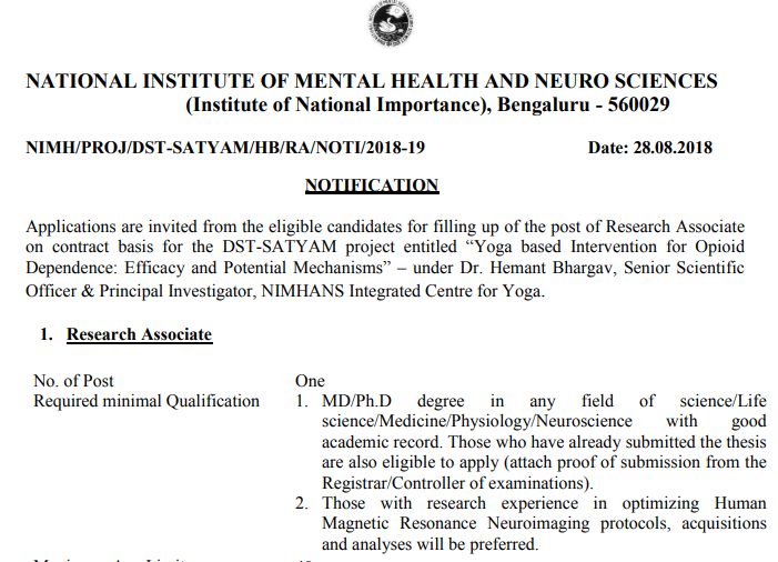 Unlike in Yoga Therapist, in Research Associate Post, those with research experience in optimizing Human Magnetic Resonance Neuroimaging protocols, acquisitions and analyses will be preferred. Under Dr Hemant Bhargav, NIMHANS Integrated Centre for Yoga Senior Scientific Officer and Principal Investigator, a DST-SATYAM project named “Yoga-based intervention for Opioid Dependence: Efficiency and Potential Mechanisms” is going on for which this recruitment procedure is extremely mandatory.