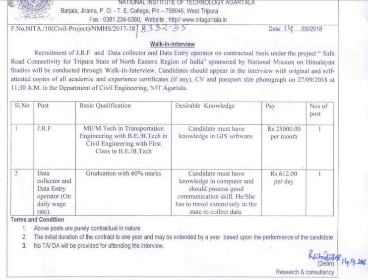 NIT Agartala Recruitment 2018: JRF, Data Collector, Data Entry Operator Jobs Online – Dean, Research and Consultancy, National Institute of Technology, Agartala has released an official Recruitment for Job vacancy for Walk-in-Interview on 14th September 2018. Mainly disclosing three terms and conditions as in the duration of attending the interview, no travelling allowance or dearness allowance will be given to the candidates.
