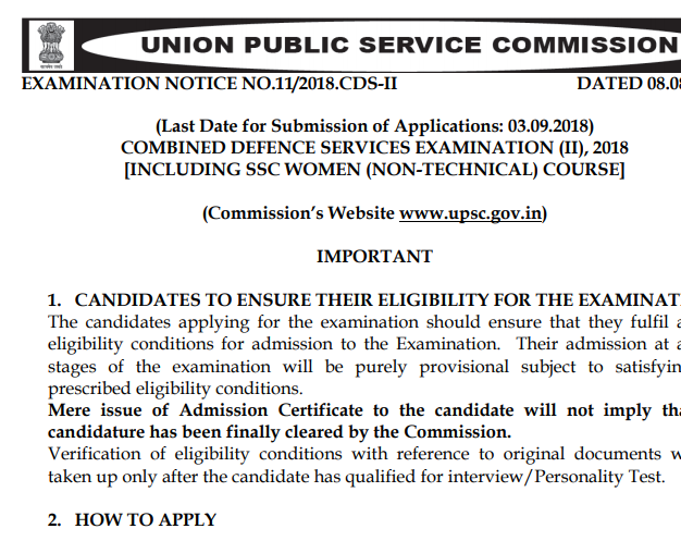 Union Public Service Commission made the Combined Defence Services examination public on 8th August. The commission conducts the CDS exam twice a year and the second test would be organised on 18th November. For that, the registration procedure is commenced and candidates can apply online till 3rd September.